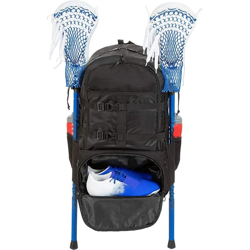 It features specialized compartments for two lacrosse sticks, a helmet, cleats (in an isolated section), gloves, pads, goggles, and water bottles—all kept neatly in place.